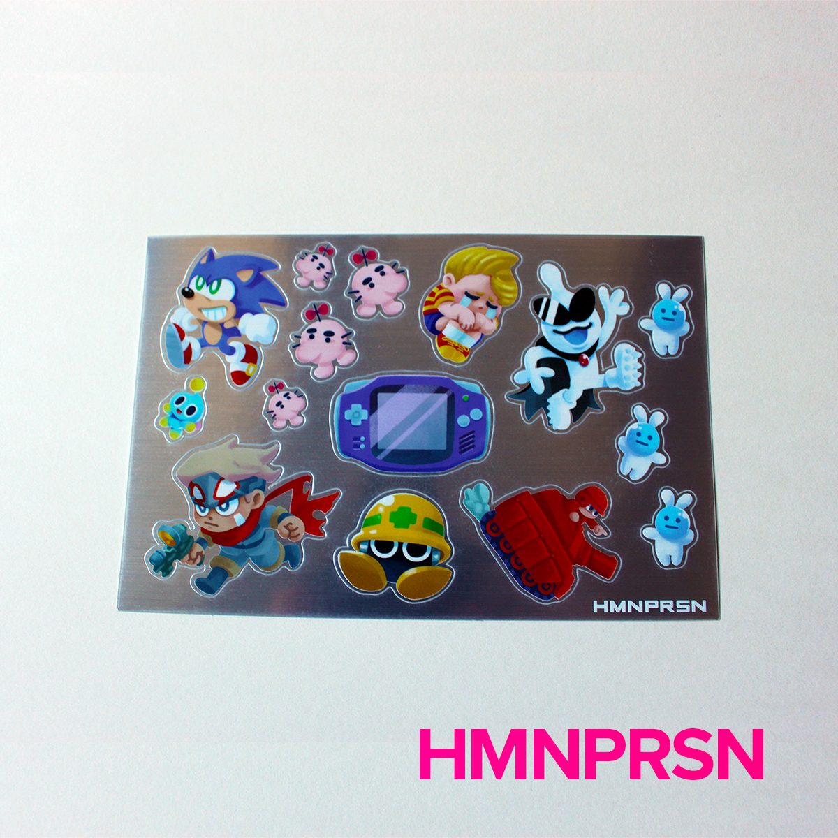 One brushed metal 4"/6" weatherproof decal sheet featuring a healthy dose of Gameboy Advance nostalgia. Featuring little guys from Boktai, Advance Wars, Sonic Advance, Mother 3, Warioware, and Megaman Battle Network.