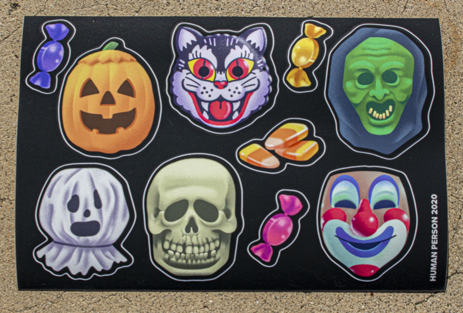 4/6" weatherproof sticker sheet featuring retro masks, some of which should be familiar to fans of John Carpenter's Halloween series.